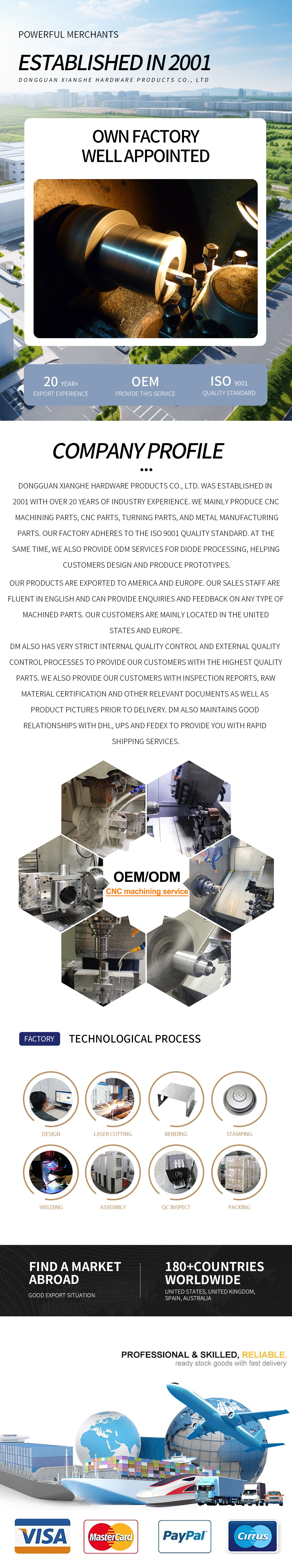 Dongguan Xianghe Hardware Products Co., Ltd. was established in 2001 with over 20 years of industry experience. We mainly produce CNC machining parts, CNC parts, turning parts, and metal manufacturing parts. Our factory has passed ISO9001 quality system certification. At the same time, we also provide ODM services for diode processing, helping customers design and produce prototypes.