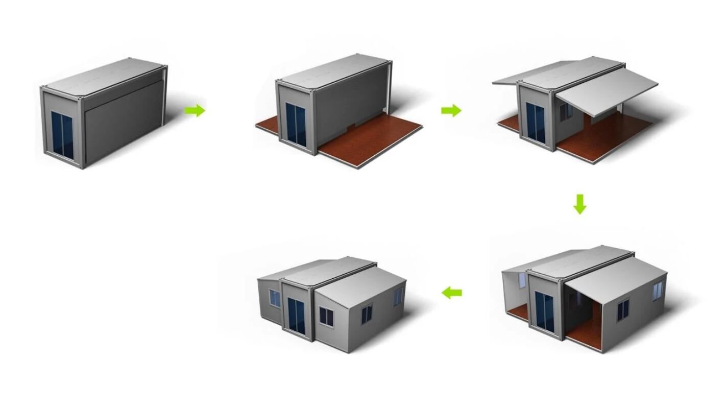 The double-wing expandable house is an innovative temporary building. Steel and other materials are used as the frame structure materials, and color steel plates, sandwich panels, etc. are mostly used for the walls and roofs. It has foldable or extendable "double-wing" structures on both sides. When not unfolded, the overall structure is compact for transportation and storage. After unfolding, the usable area can be greatly increased. The construction method is mostly prefabricated and assembled. Components are produced in the factory and then transported to the site for assembly. It has the advantages of good earthquake resistance, deformation resistance, sealing, heat preservation and insulation performance. It is suitable for construction sites, commercial activities, tourist attractions, emergency rescue and other scenarios, and is an emerging product in the field of modern architecture.