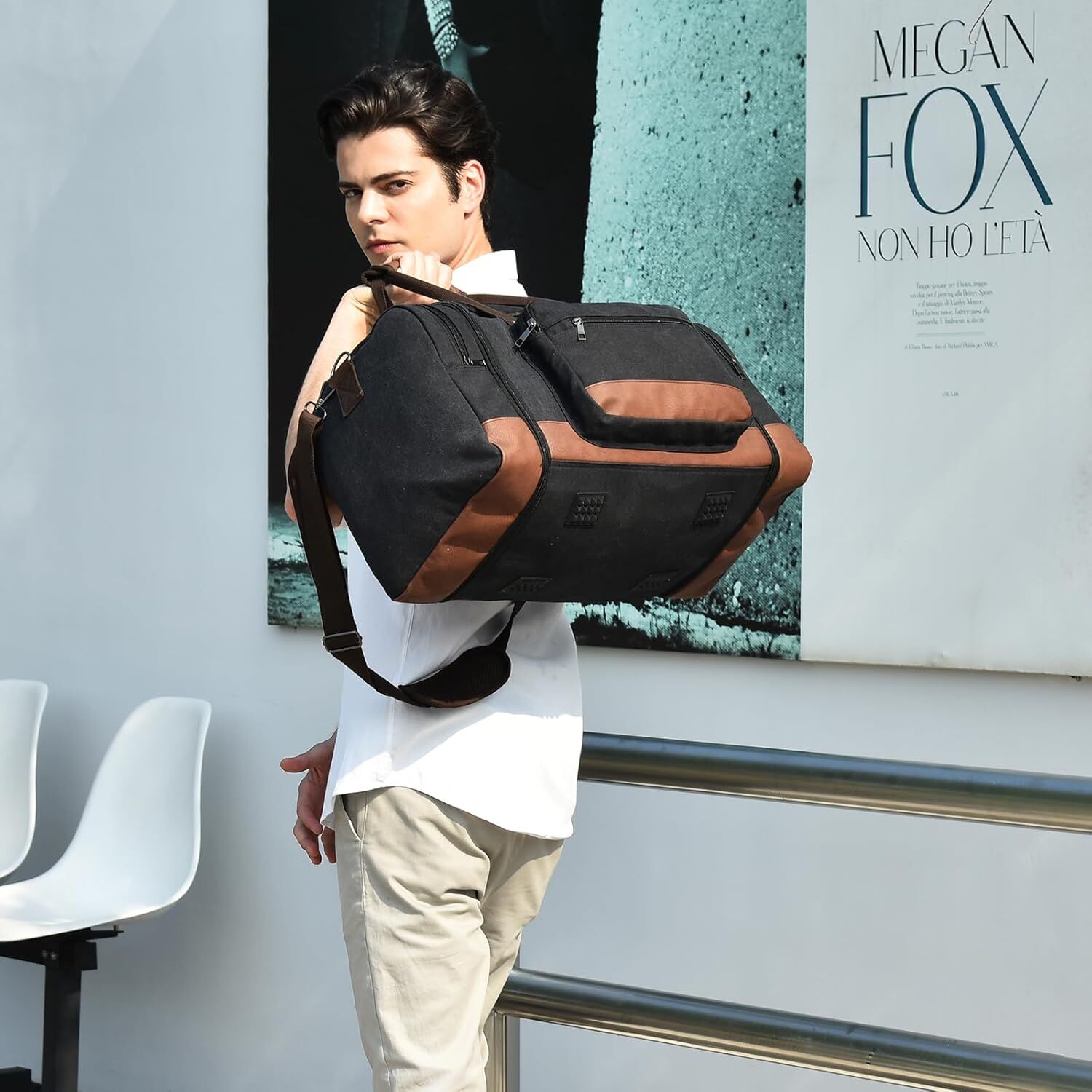 This carry on bag is (L) 20.87 x (W) 11.81 x (H) 10.24 inches in size, with 2 side zippers pulled down to extend the weekender bag to 23.62 inches in length. The travel duffel bags can also be carried on an airplane to facilitate your travel.