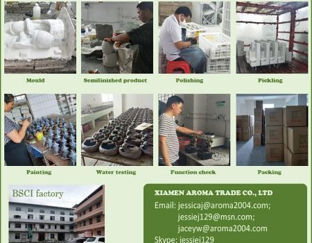 We, Xiamen Aroma Trade Co., LTD, are an exporter in Xiamen, China, who have been exporting indoor and outdoor water fountains for about 20 years. Main material is polyresin, some metal and GRC, size from 15cm high to 120cm high.