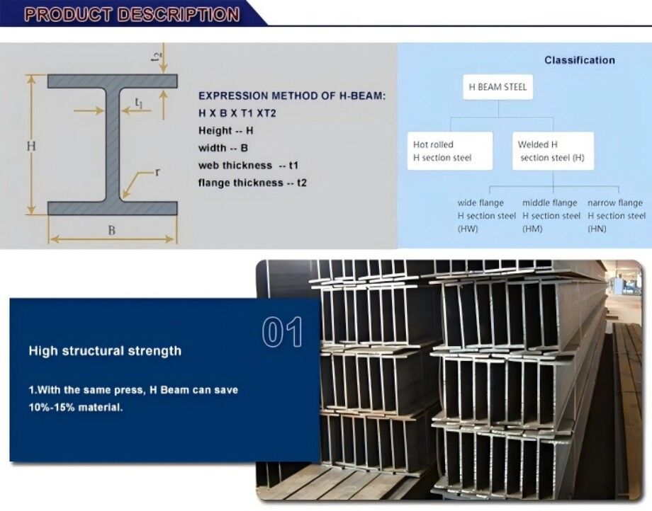 H-beam steel (also known as H-section steel) is a versatile structural member named for its distinctive H-shaped cross-section, celebrated for exceptional strength-to-weight ratio, superior bending resistance, and easy fabrication. Available in two primary types—hot rolled H-beam and welded H-beam (including submerged arc welding and high-frequency welding variants)—it adheres to international standards such as ASTM A572, EN S235JR/S275JR/S355JR, BS, DIN, JIS, and GB specifications like Q235, Q355B, Q420C, Q500, as well as A36 and G350 grades. Crafted from high-quality mild carbon steel, low alloy steel, and corrosion-resistant Corten steel options, this structural steel delivers high dimensional accuracy, standardized production, and cost-efficiency for diverse engineering needs.