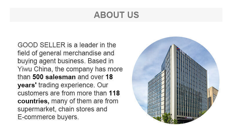 About Us: GOOD SELLER is a leader in the field of general merchandise and buying agent business. Based in Yiwu China, the company has more than 100 salesman and over 18 years' trading experience, We have three 6000sqm showrooms in Yiwu, Ningbo&Shantou, displaying more than 50,000 items directly from over 8,000 factories. Our customers are form more than 118 countries, many of them are from chain stores and supermarket.