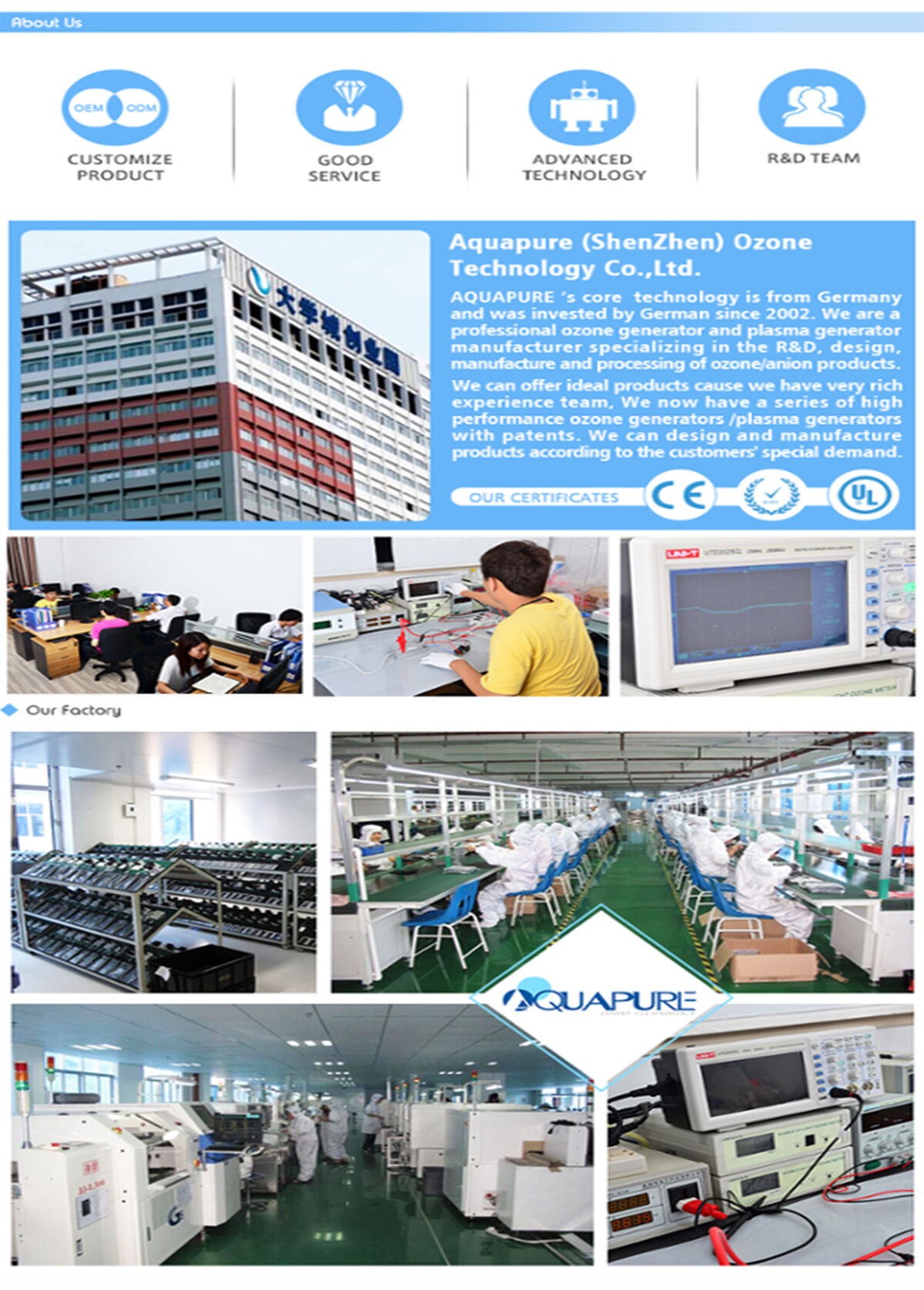AQUAPURE's core technology is from Germany and was invested by German since 2002. We are mainly manufacture ozone generators, plasma generators and anion generators in China. We Committed to the standardization of the ozone market, Our group is making great effort in the high quality and stable performance. To combine the high technology from Germany with low labor cost from China, we set up AQUPAURE ASIA LIMITED and AQUAPURE (Shenzhen) Ozone Technology CO.LTD for production and shipment managements in 2009 and 2015. We have more than 10 years' experience in the production and development of ozone generator .